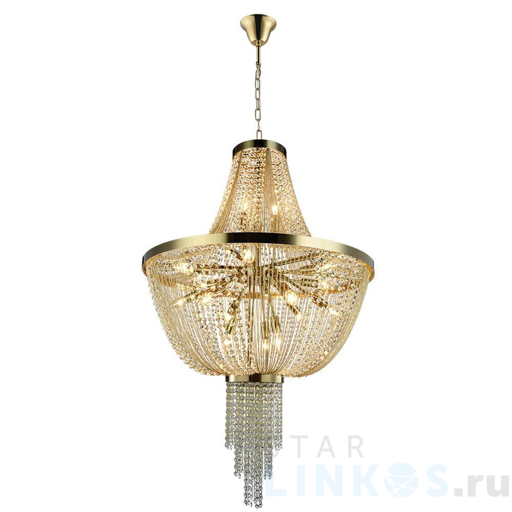 Поставщик рекомендует использовать лампы накаливания с цоколем E14 для освещения площади 40 м2. Подвесная люстра Lumien Hall Лиссоне LH0043/18P-GDCG в классическом стиле используется в интерьере больших залов с установкой на потолок.