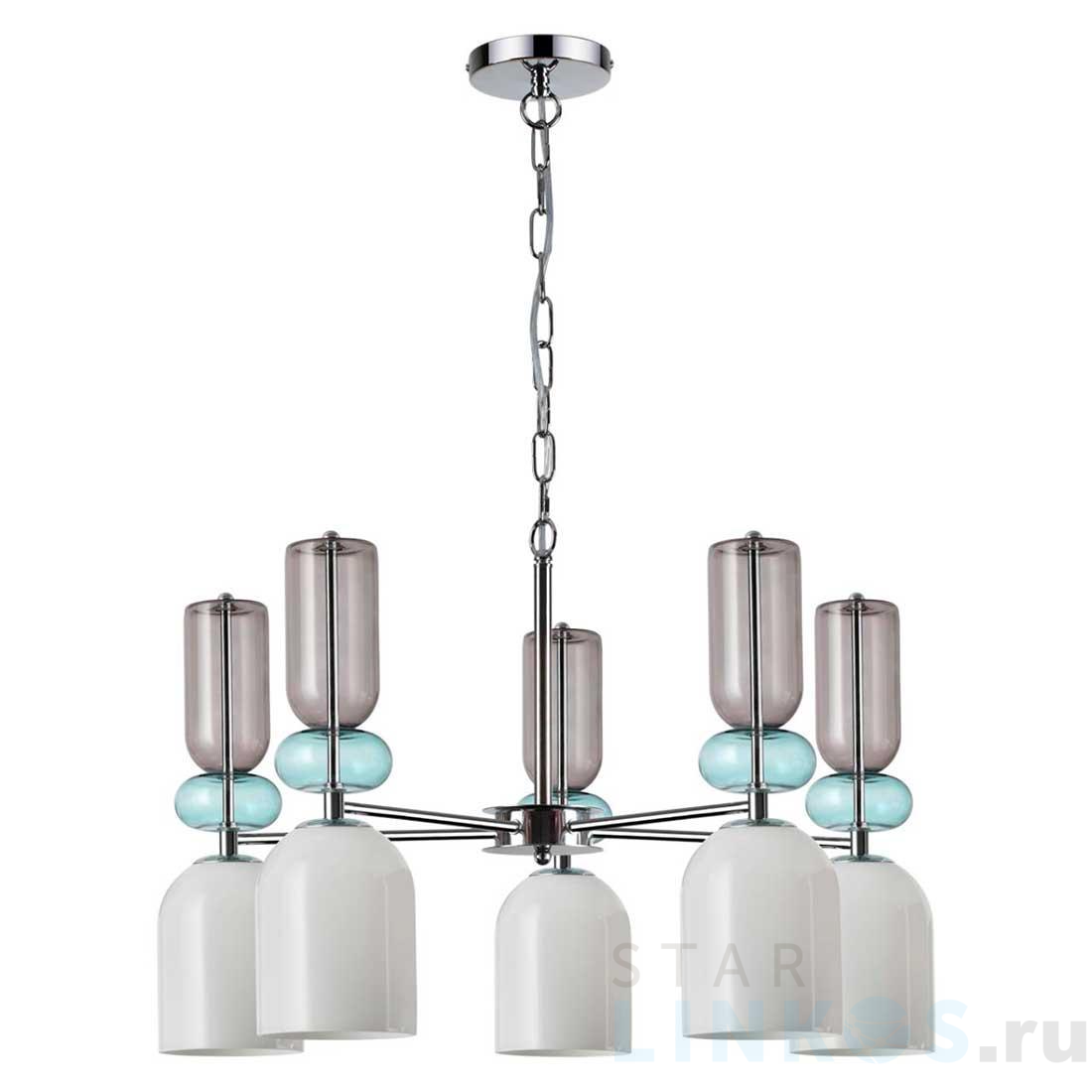 Поставщик рекомендует использовать лампы накаливания с цоколем E27 для освещения площади 15 м2. Подвесная люстра Lumion Moderni Gillian 5235/5 в используется в интерьере спальни с установкой на потолок.