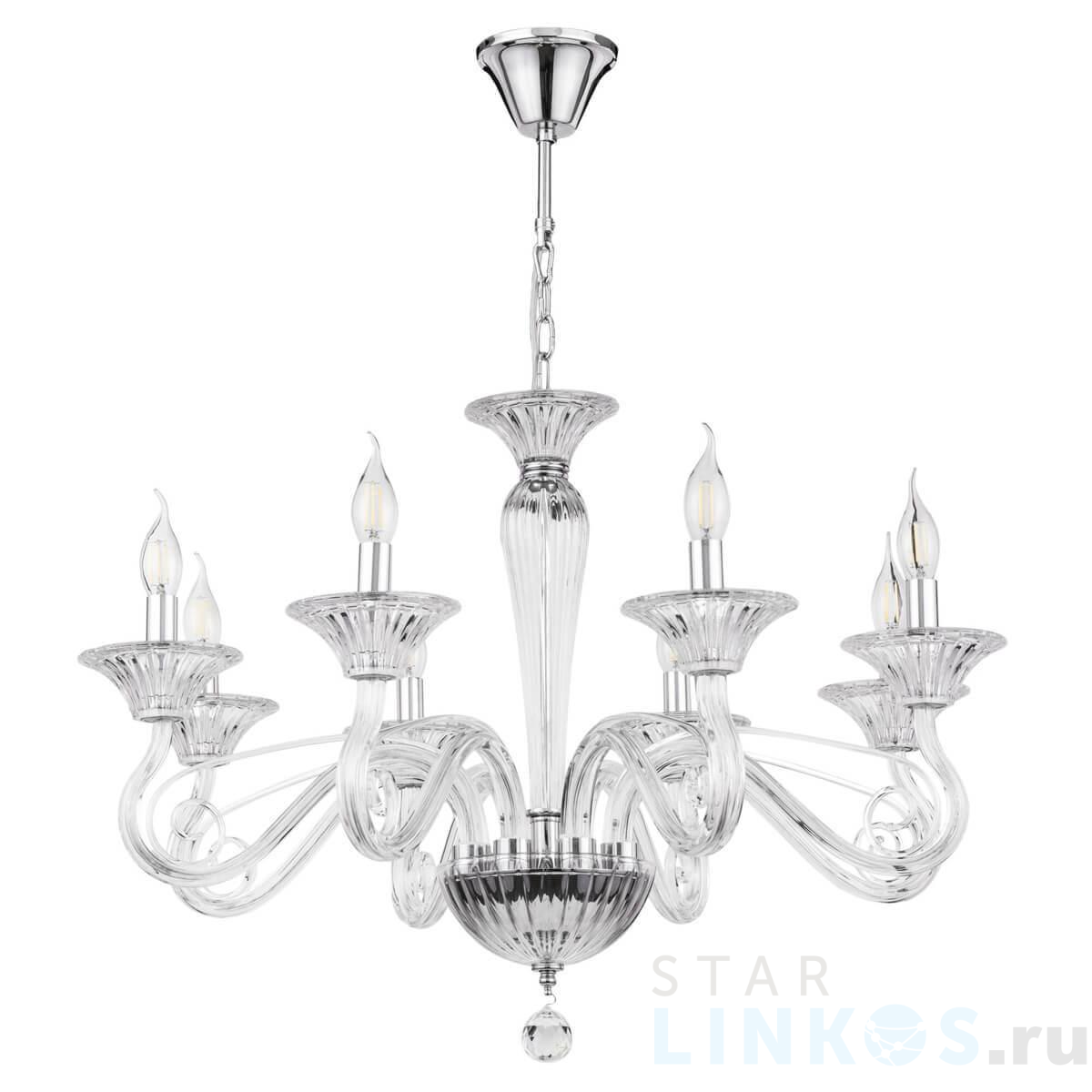 Поставщик рекомендует использовать лампы накаливания с цоколем E14 для освещения площади 17,8 м2. Подвесная люстра Maytoni Acqua DIA010PL-08TR в классическом стиле используется в интерьере гостиной с установкой на потолок.