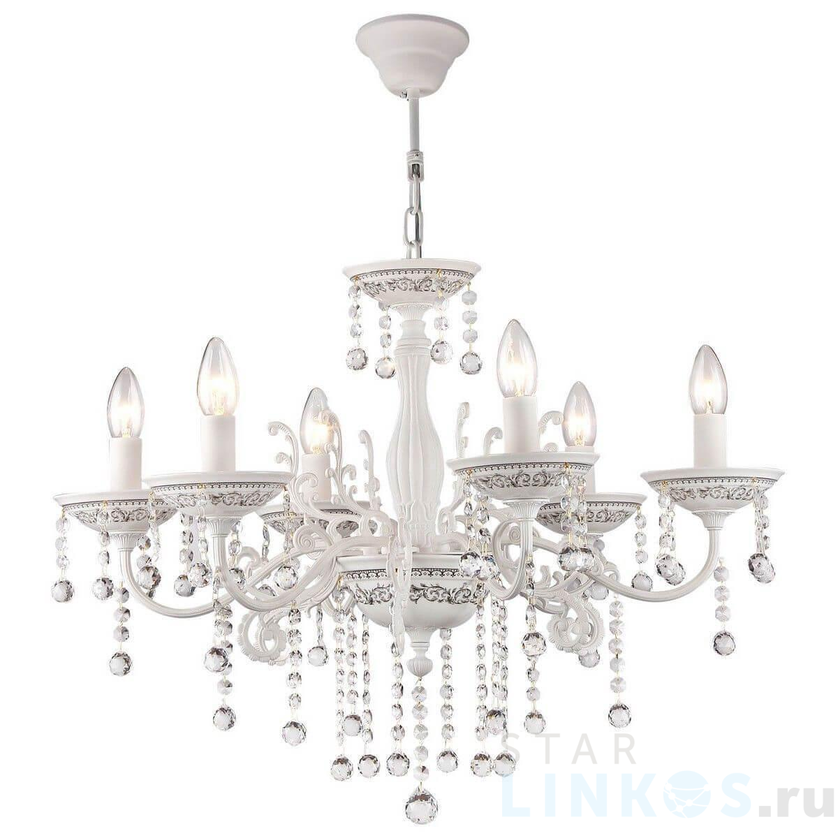Поставщик рекомендует использовать лампы накаливания с цоколем E14 для освещения площади 20 м2. Подвесная люстра Maytoni Bellona ARM386-06-W в классическом стиле используется в интерьере гостиной с установкой на потолок.