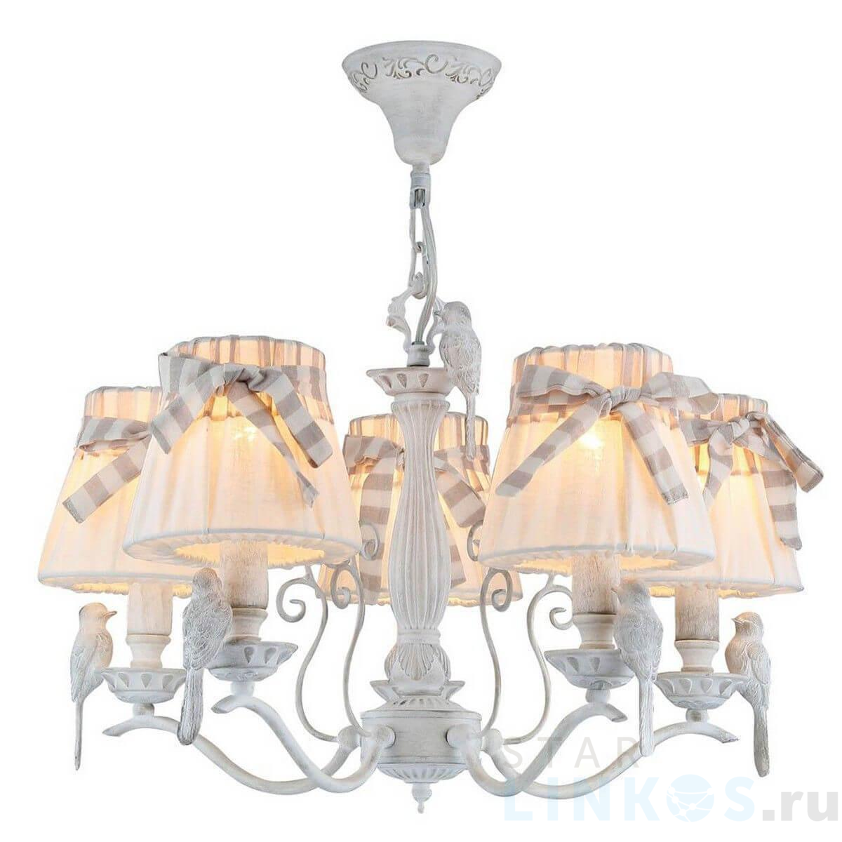 Поставщик рекомендует использовать лампы накаливания с цоколем E14 для освещения площади 11,1 м2. Подвесная люстра Maytoni Bird ARM013-05-W в стиле прованс используется в интерьере спальни с установкой на потолок.