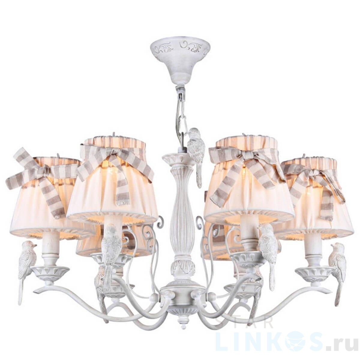 Поставщик рекомендует использовать лампы накаливания с цоколем E14 для освещения площади 13,3 м2. Подвесная люстра Maytoni Bird ARM013-06-W в стиле прованс используется в интерьере спальни с установкой на потолок.