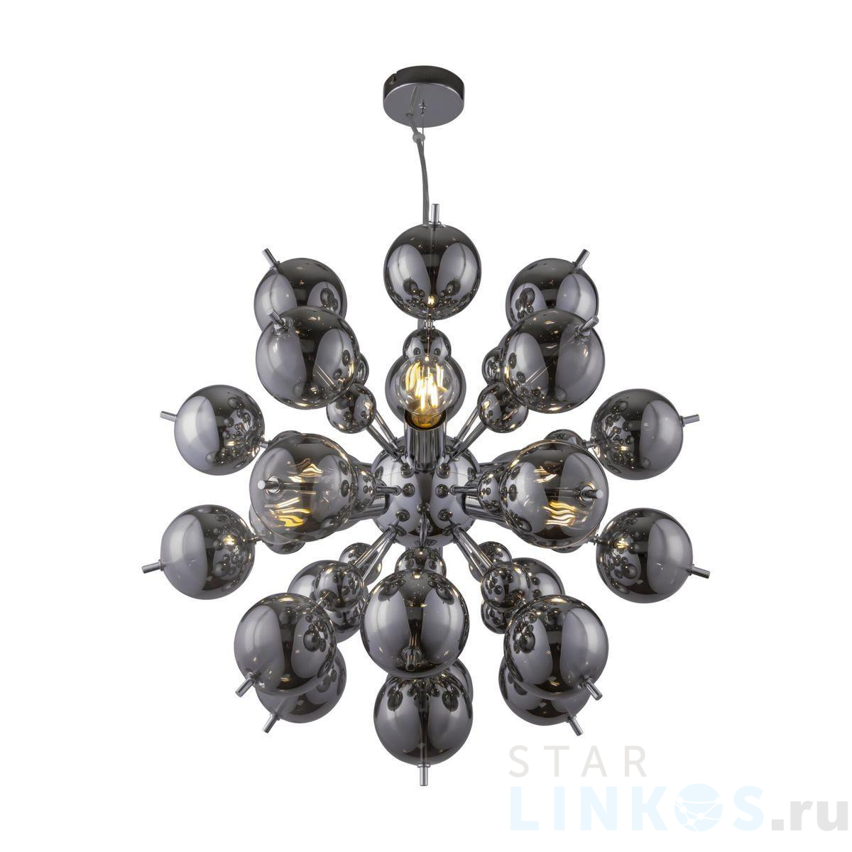 Поставщик рекомендует использовать лампы накаливания с цоколем E27 для освещения площади 20 м2. Подвесная люстра Maytoni Bolla MOD133PL-06CH в современном стиле используется в интерьере гостиной с установкой на потолок.