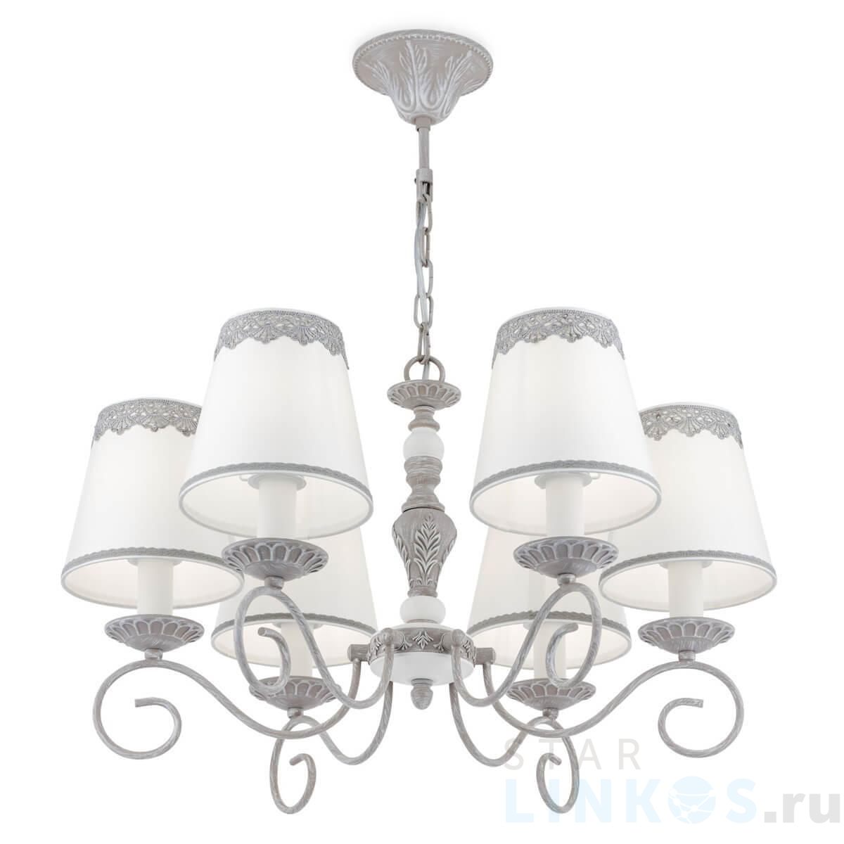 Поставщик рекомендует использовать лампы накаливания с цоколем E14 для освещения площади 13,3 м2. Подвесная люстра Maytoni Bouquet ARM023-06-S в используется в интерьере спальни с установкой на потолок.