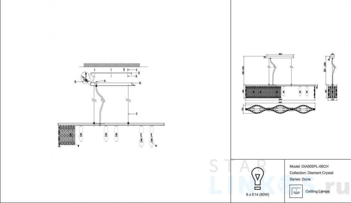 Поставщик рекомендует использовать лампы накаливания с цоколем E14 для освещения площади 20 м2. Подвесная люстра Maytoni Dune DIA005PL-06CH в используется в интерьере спальни с установкой на потолок.
