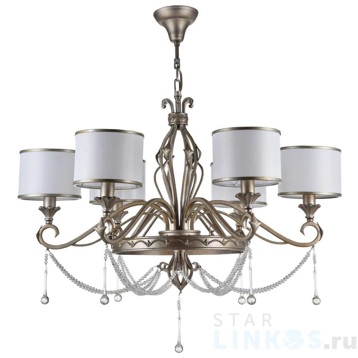 Поставщик рекомендует использовать лампы накаливания с цоколем E14 для освещения площади 13,3 м2. Подвесная люстра Maytoni Fiore H235-06-G в используется в интерьере спальни с установкой на потолок.