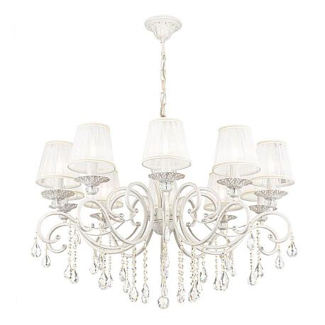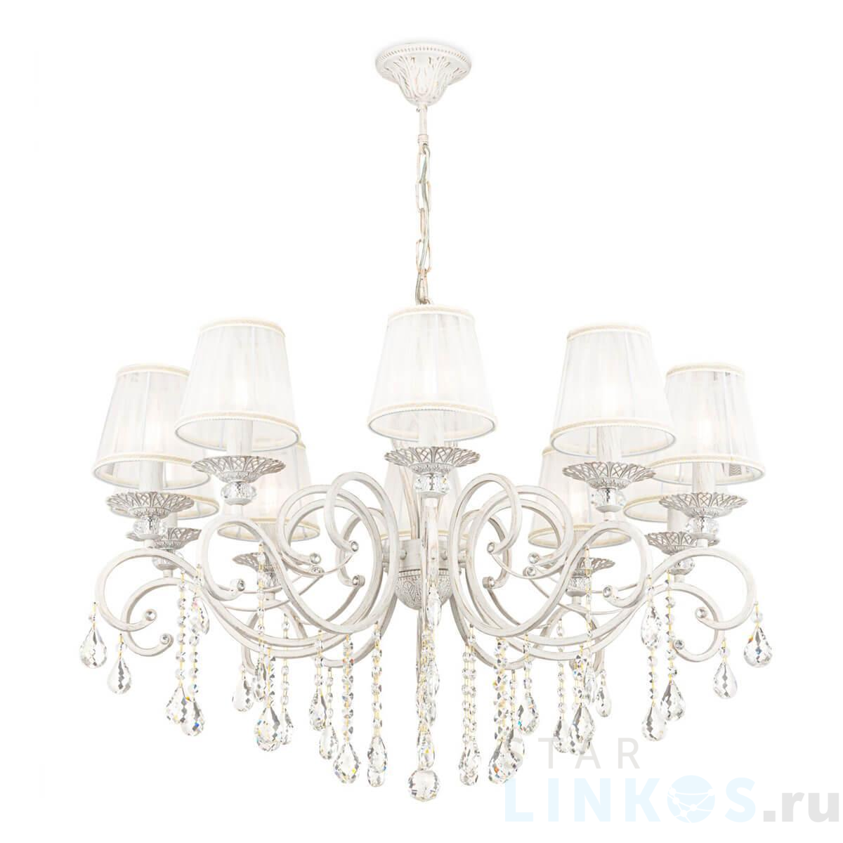 Поставщик рекомендует использовать лампы накаливания с цоколем E14. Подвесная люстра Maytoni Grace ARM247-10-G в стиле прованс используется в интерьере гостиной с установкой на потолок.