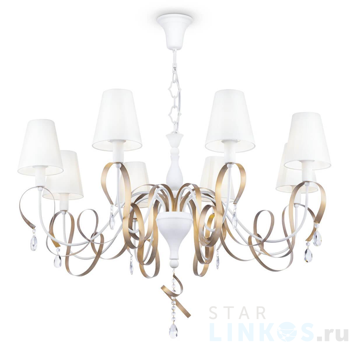 Поставщик рекомендует использовать лампы накаливания с цоколем E14 для освещения площади 17,8 м2. Подвесная люстра Maytoni Intreccio ARM010-08-W в используется в интерьере гостиной с установкой на потолок.