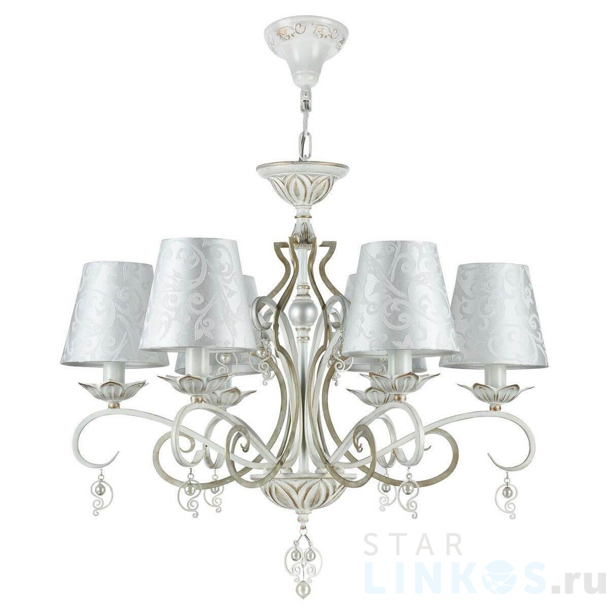 Поставщик рекомендует использовать лампы накаливания с цоколем E14 для освещения площади 13,3 м2. Подвесная люстра Maytoni Monile ARM004-06-W в используется в интерьере спальни с установкой на потолок.