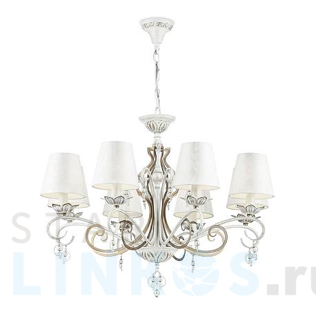Поставщик рекомендует использовать лампы накаливания с цоколем E14 для освещения площади 17,8 м2. Подвесная люстра Maytoni Monile ARM004-08-W в используется в интерьере гостиной с установкой на потолок.