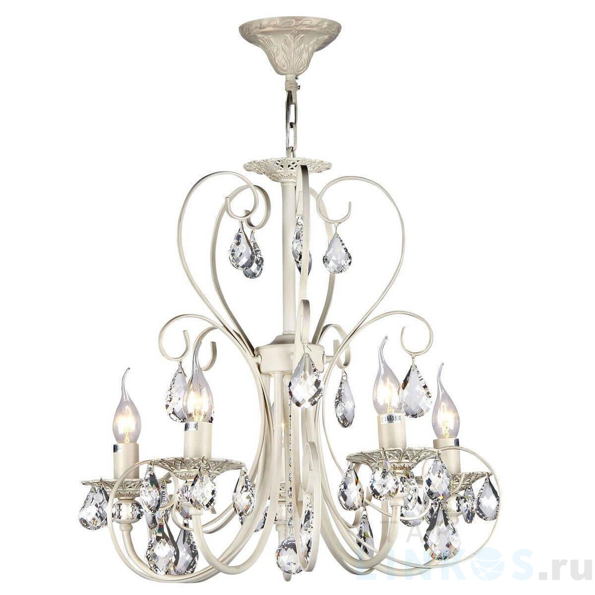 Поставщик рекомендует использовать лампы накаливания с цоколем E14. Подвесная люстра Maytoni Princess ARM270-05-R в классическом стиле используется в интерьере спальни с установкой на потолок.