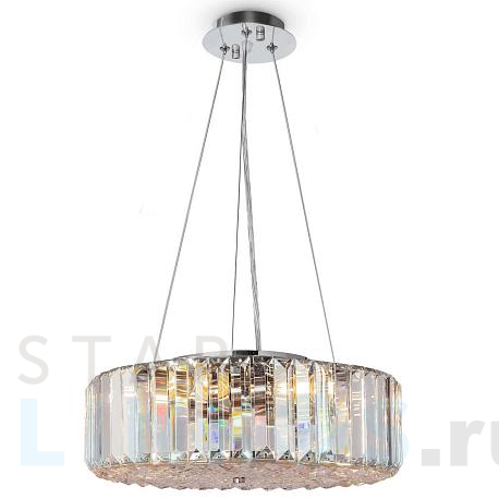 Поставщик рекомендует использовать лампы накаливания с цоколем E27 для освещения площади 20 м2. Подвесная люстра Maytoni Recinto MOD080CL-06CH в используется в интерьере гостиной с установкой на потолок.