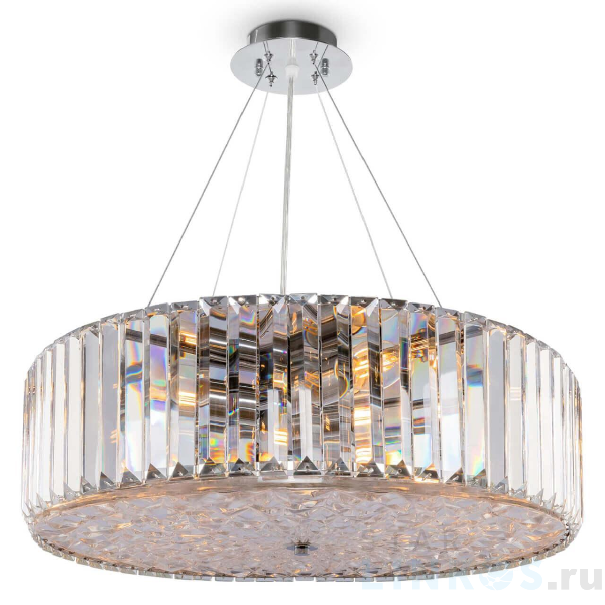 Поставщик рекомендует использовать лампы накаливания с цоколем E27 для освещения площади 26,7 м2. Подвесная люстра Maytoni Recinto MOD080CL-08CH в используется в интерьере гостиной с установкой на потолок.