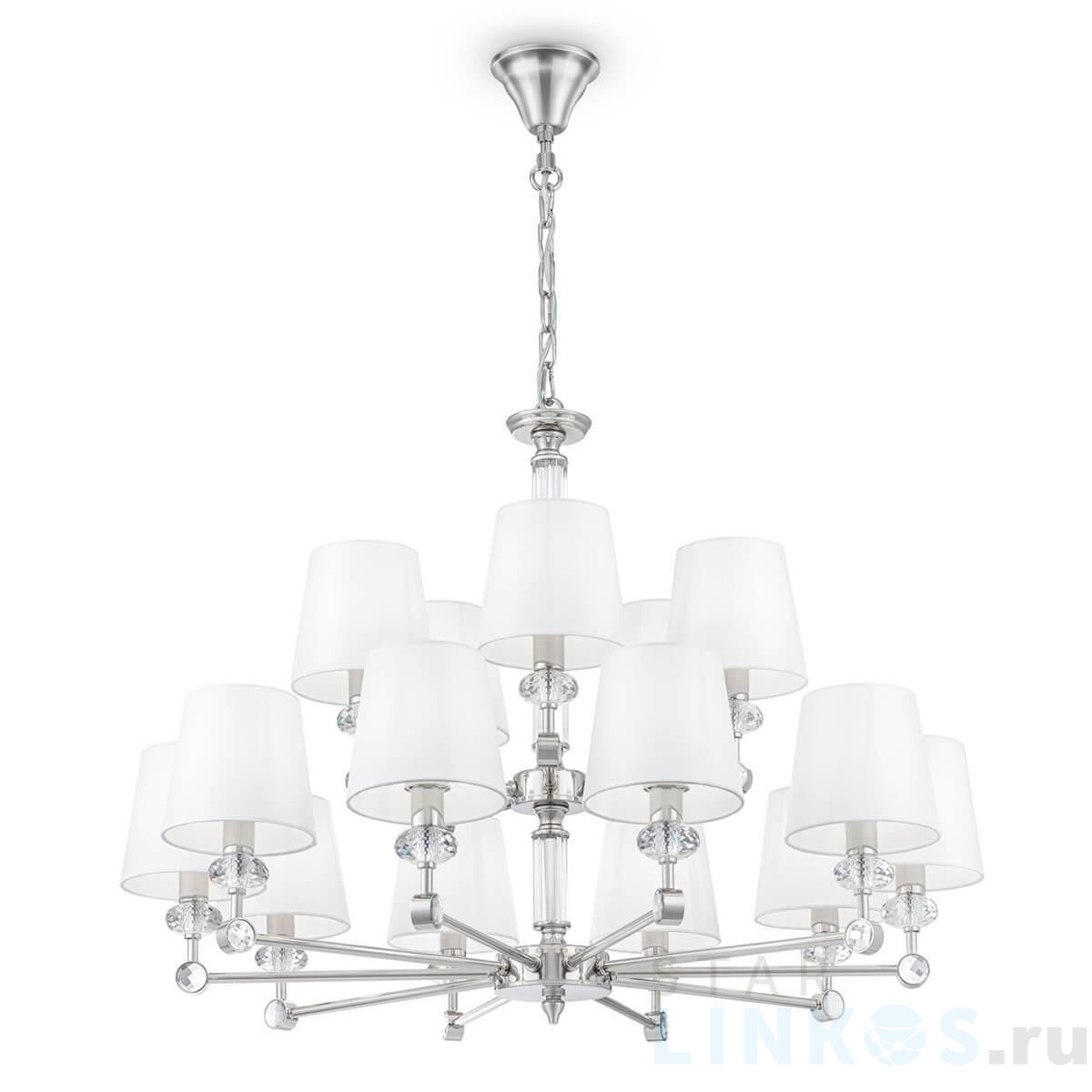 Поставщик рекомендует использовать лампы накаливания с цоколем E14 для освещения площади 33,3 м2. Подвесная люстра Maytoni Riverside MOD018PL-15CH в используется в интерьере больших залов с установкой на потолок.
