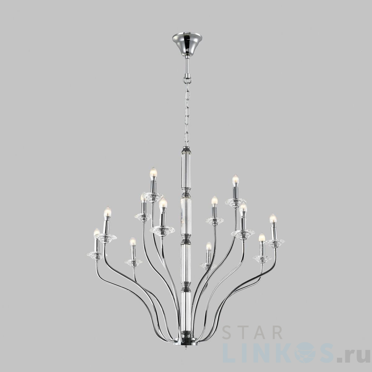Поставщик рекомендует использовать лампы накаливания с цоколем E14 для освещения площади 25 м2. Подвесная люстра Moderli Catania V10429-12P в используется в интерьере гостиной с установкой на потолок.