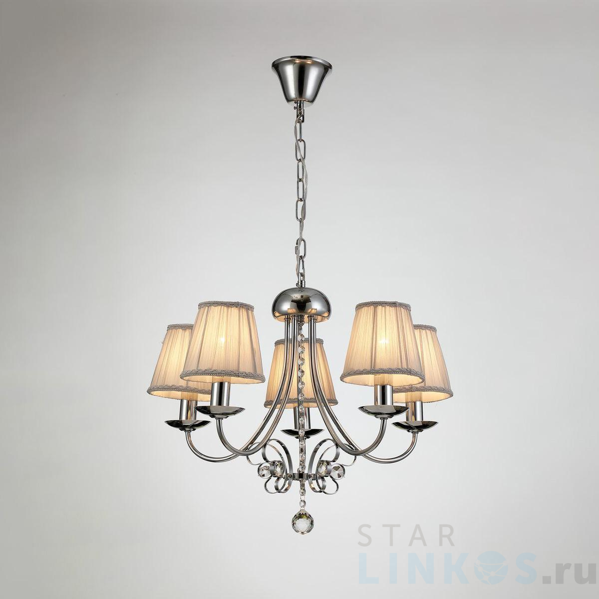 Поставщик рекомендует использовать лампы накаливания с цоколем E14 для освещения площади 20 м2. Подвесная люстра Moderli Daniel V2492-5P в используется в интерьере спальни с установкой на потолок.