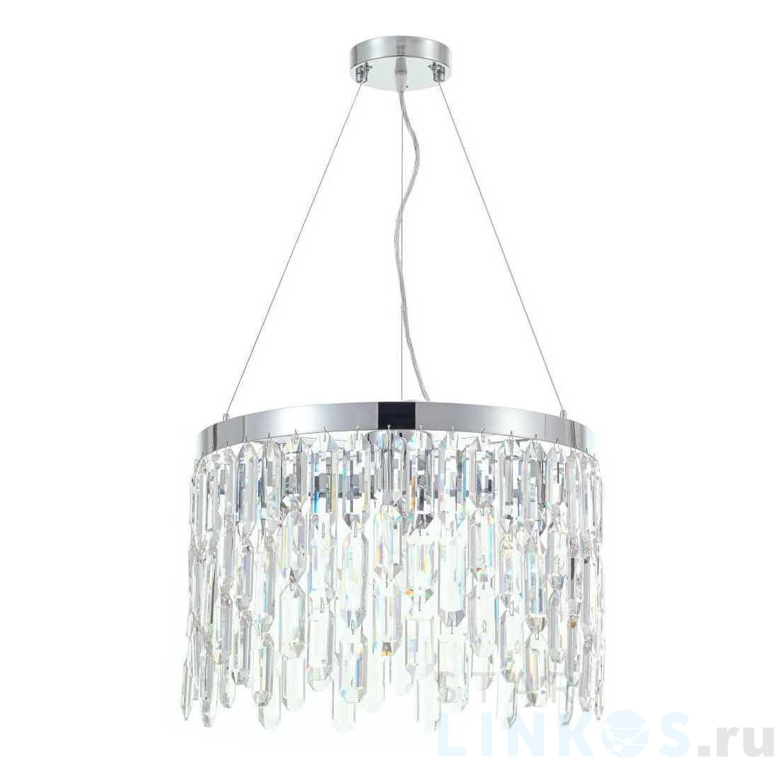 Поставщик рекомендует использовать лампы накаливания с цоколем E14 для освещения площади 12 м2. Подвесная люстра MyFar David MR1971-6P в используется в интерьере гостиной с установкой на потолок.