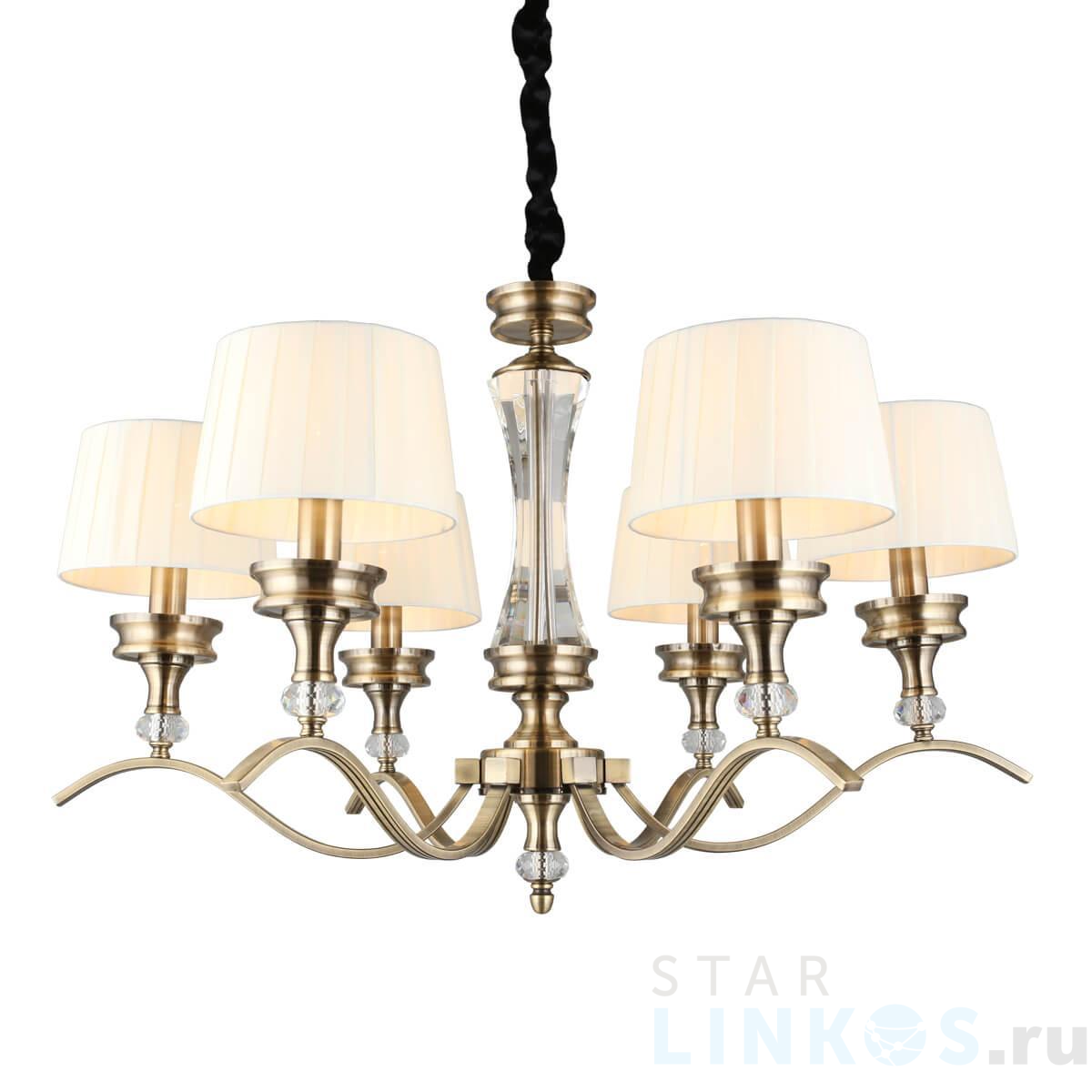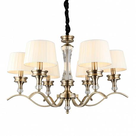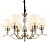 Поставщик рекомендует использовать лампы накаливания с цоколем E14 для освещения площади 12 м2. Подвесная люстра Omnilux Arosio OML-88413-06 в классическом стиле используется в интерьере спальни с установкой на потолок.