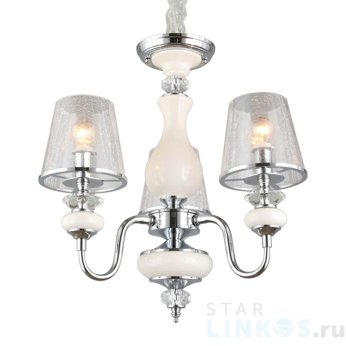 Поставщик рекомендует использовать лампы накаливания с цоколем E14 для освещения площади 6,7 м2. Подвесная люстра Omnilux Aviano OML-84603-03 в классическом стиле используется в интерьере спальни с установкой на потолок.