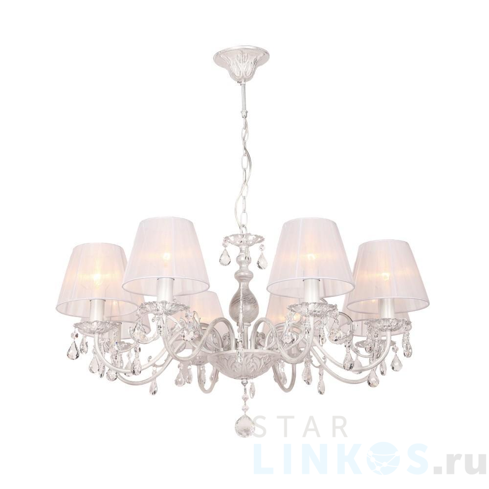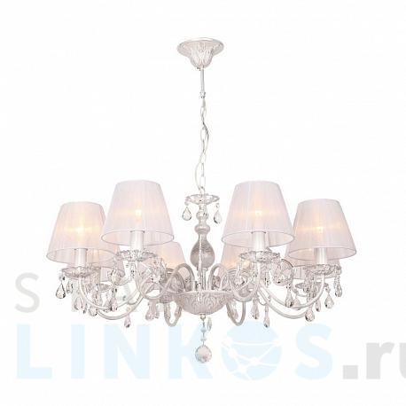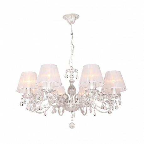 Поставщик рекомендует использовать лампы накаливания с цоколем E14 для освещения площади 18 м2. Подвесная люстра Omnilux Bantine OML-53213-08 в классическом стиле используется в интерьере гостиной с установкой на потолок.