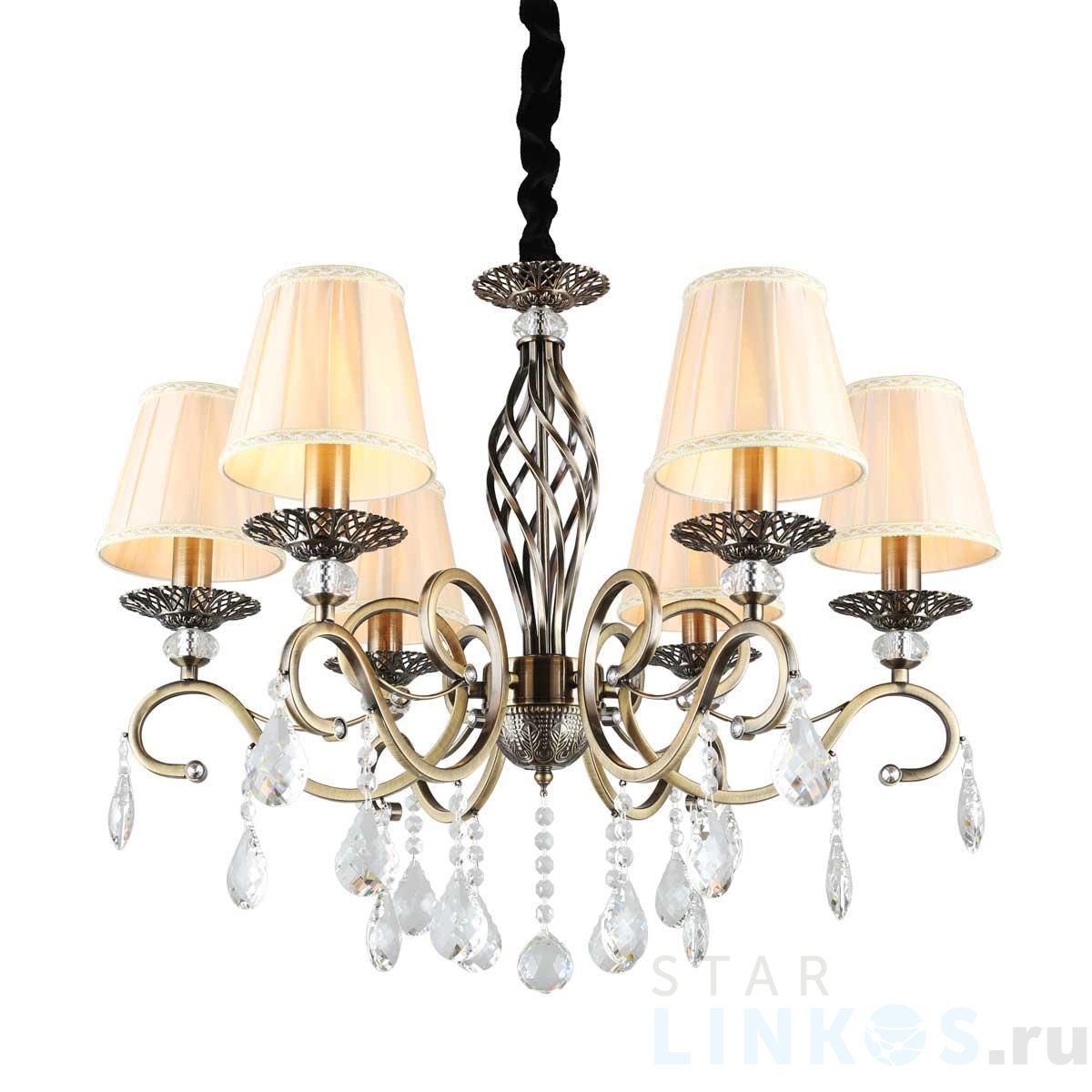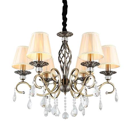 Поставщик рекомендует использовать лампы накаливания с цоколем E14. Подвесная люстра Omnilux Belluno OML-79113-06 в классическом стиле используется в интерьере спальни с установкой на потолок.