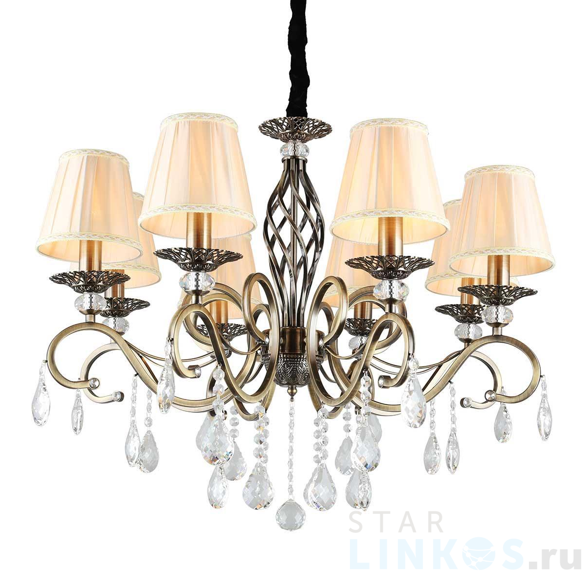 Поставщик рекомендует использовать лампы накаливания с цоколем E14. Подвесная люстра Omnilux Belluno OML-79113-08 в классическом стиле используется в интерьере гостиной с установкой на потолок.