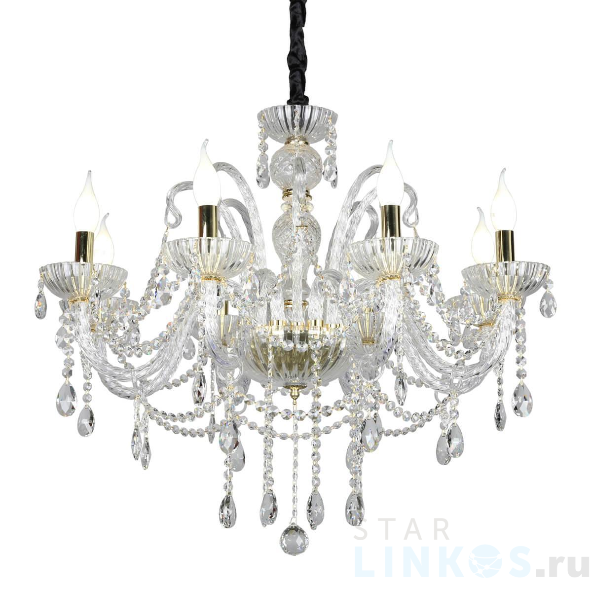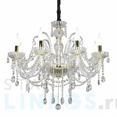 Поставщик рекомендует использовать лампы накаливания с цоколем E14 для освещения площади 18 м2. Подвесная люстра Omnilux Bonaita OML-70103-08 в классическом стиле используется в интерьере гостиной с установкой на потолок.