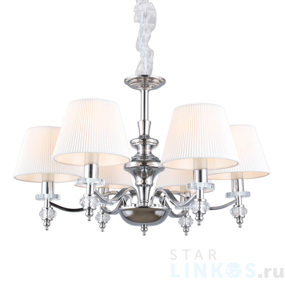 Поставщик рекомендует использовать лампы накаливания с цоколем E14 для освещения площади 12 м2. Подвесная люстра Omnilux Caorle OML-72703-06 в классическом стиле используется в интерьере гостиной с установкой на потолок.