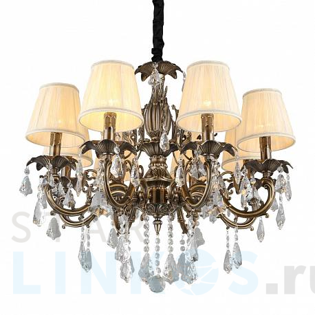 Поставщик рекомендует использовать лампы накаливания с цоколем E14 для освещения площади 18 м2. Подвесная люстра Omnilux Catanzaro OML-30813-08 в классическом стиле используется в интерьере гостиной с установкой на потолок.