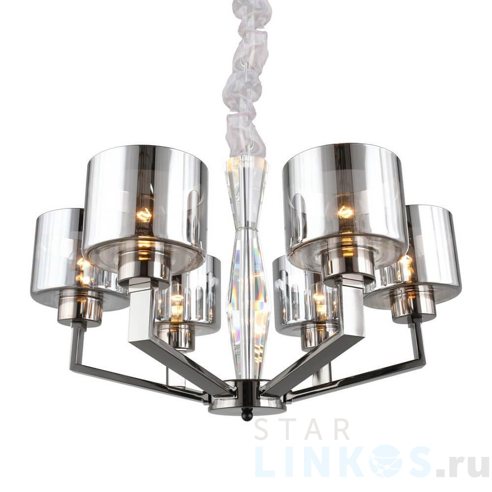 Поставщик рекомендует использовать лампы накаливания с цоколем E27 для освещения площади 13,3 м2. Подвесная люстра Omnilux Lizzano OML-88903-06 в современном стиле используется в интерьере спальни с установкой на потолок.