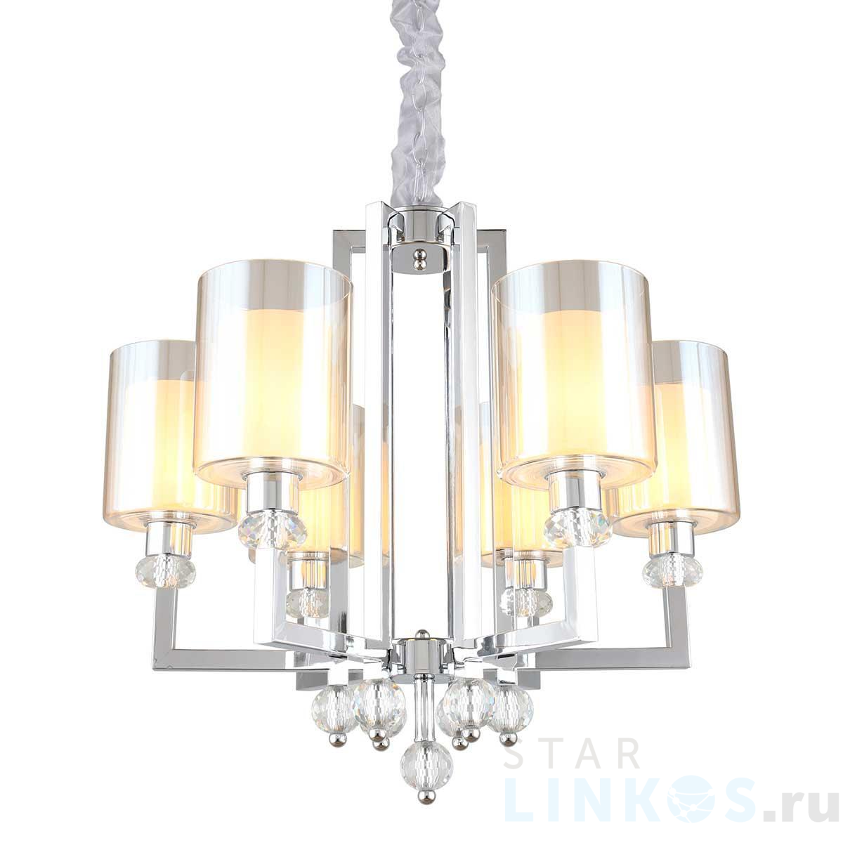 Поставщик рекомендует использовать лампы накаливания с цоколем E27 для освещения площади 13,3 м2. Подвесная люстра Omnilux Malito OML-79903-06 в используется в интерьере гостиной с установкой на потолок.