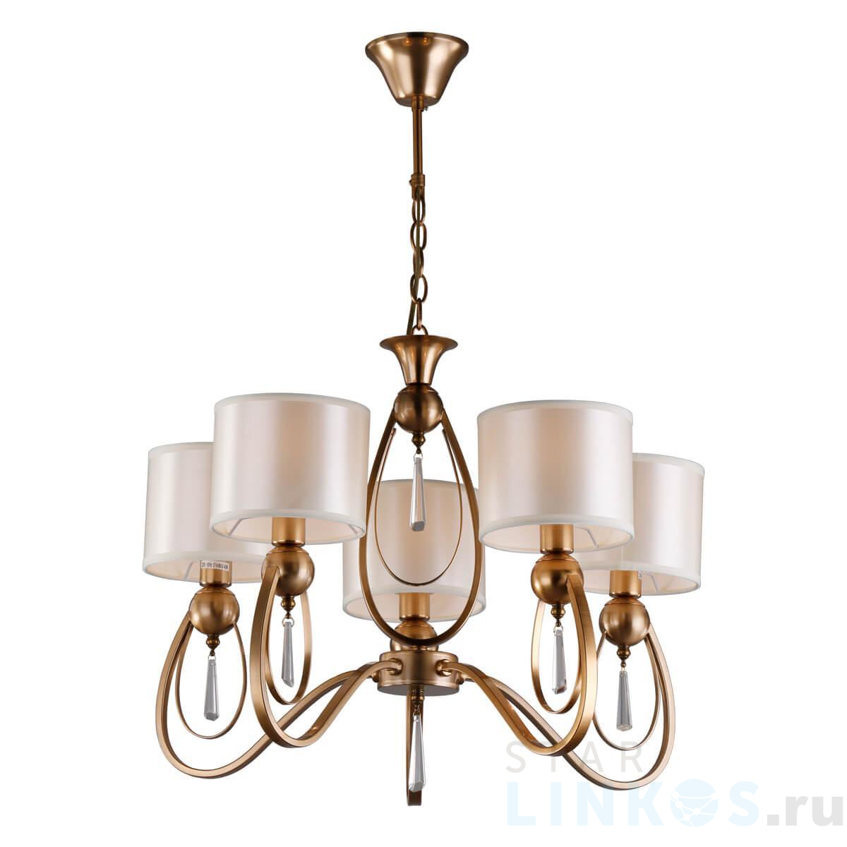 Поставщик рекомендует использовать лампы накаливания с цоколем E14 для освещения площади 12 м2. Подвесная люстра Omnilux Mellitto OML-63813-05 в классическом стиле используется в интерьере спальни с установкой на потолок.