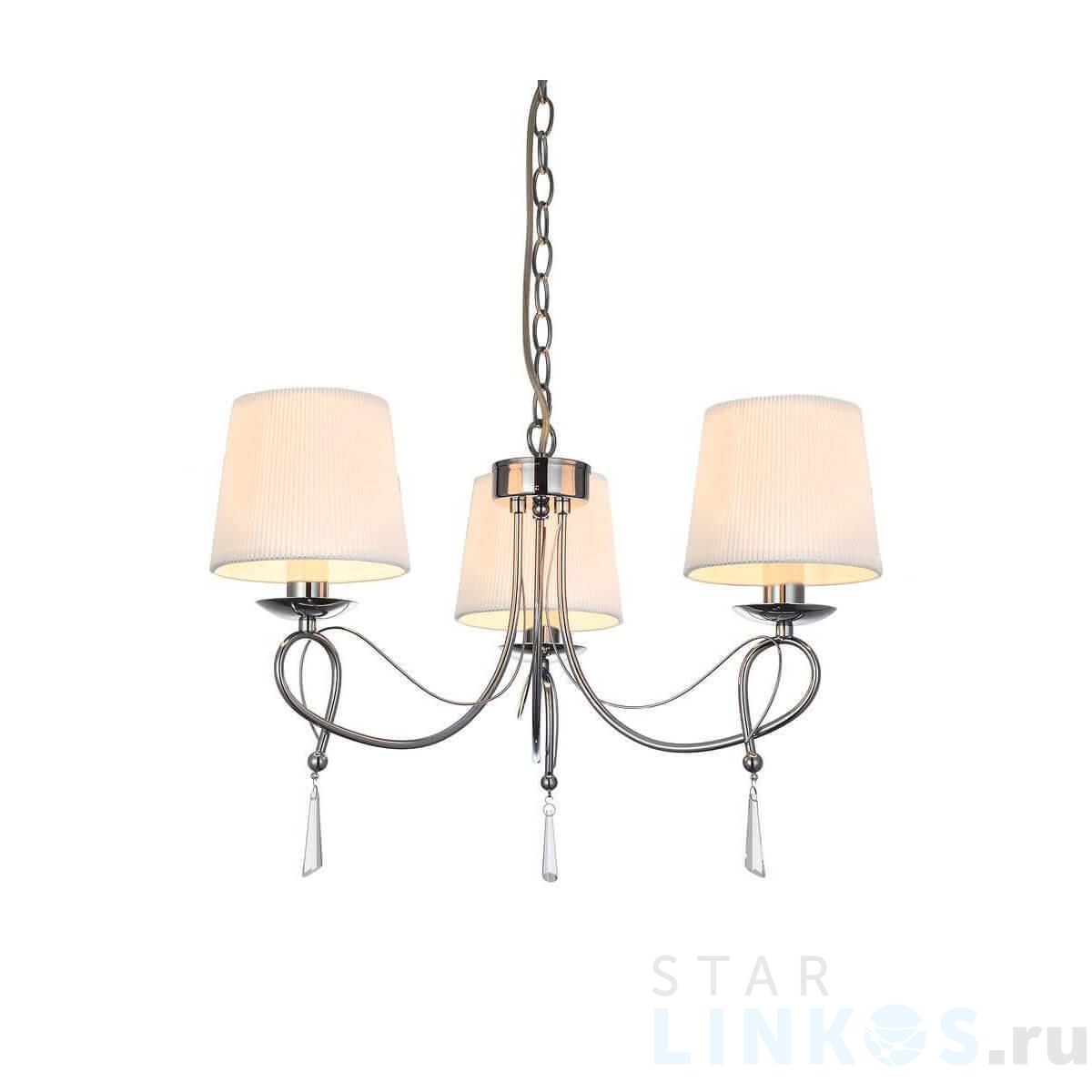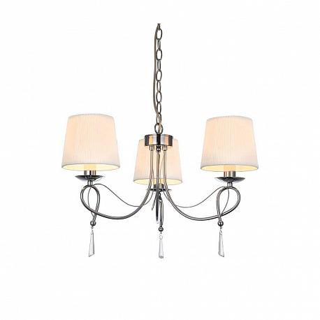 Поставщик рекомендует использовать лампы накаливания с цоколем E14 для освещения площади 7 м2. Подвесная люстра Omnilux OML-61503-03 в классическом стиле используется в интерьере спальни с установкой на потолок.