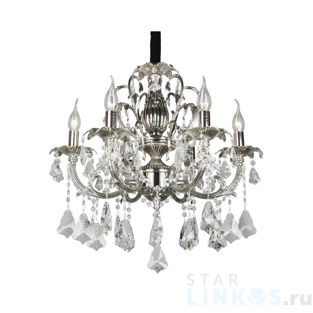 Поставщик рекомендует использовать лампы накаливания с цоколем E14 для освещения площади 20 м2. Подвесная люстра Omnilux OML-77713-06 в классическом стиле используется в интерьере гостиной с установкой на потолок.