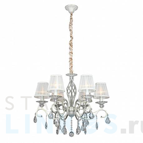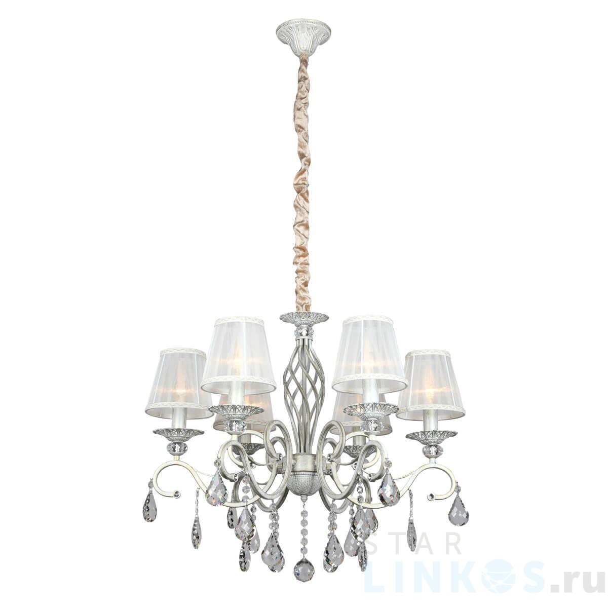 Поставщик рекомендует использовать лампы накаливания с цоколем E14 для освещения площади 14 м2. Подвесная люстра Omnilux OML-79103-06 в классическом стиле используется в интерьере спальни с установкой на потолок.