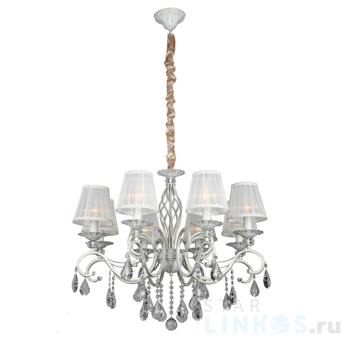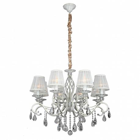 Поставщик рекомендует использовать лампы накаливания с цоколем E14 для освещения площади 18 м2. Подвесная люстра Omnilux OML-79103-08 в классическом стиле используется в интерьере гостиной с установкой на потолок.