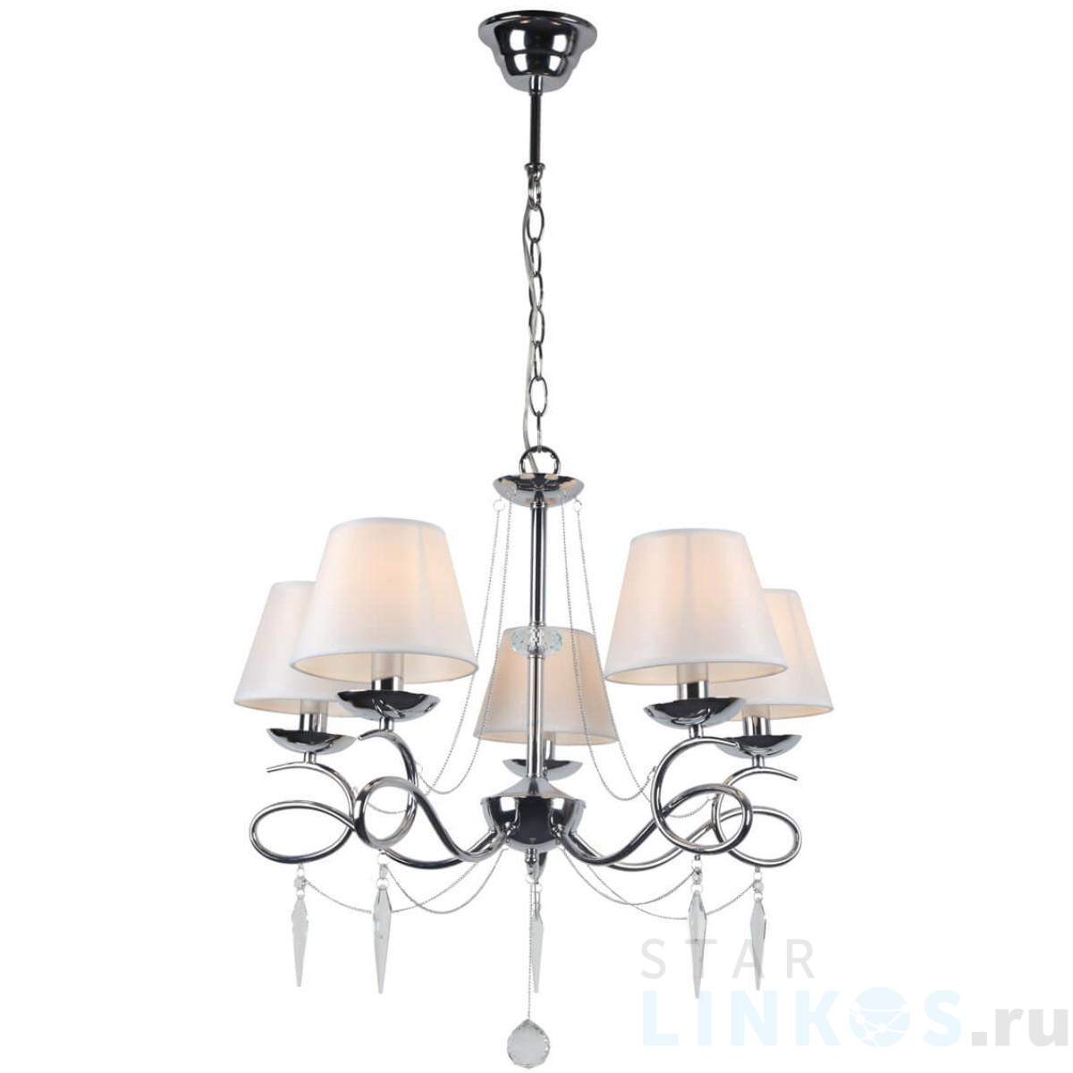 Поставщик рекомендует использовать лампы накаливания с цоколем E14 для освещения площади 12 м2. Подвесная люстра Omnilux Padru OML-53303-05 в используется в интерьере спальни с установкой на потолок.