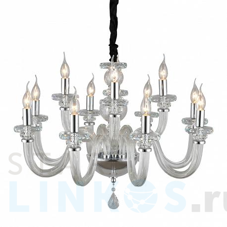 Поставщик рекомендует использовать лампы накаливания с цоколем E14 для освещения площади 40 м2. Подвесная люстра Omnilux Scalea OML-89303-12 в классическом стиле используется в интерьере гостиной с установкой на потолок.