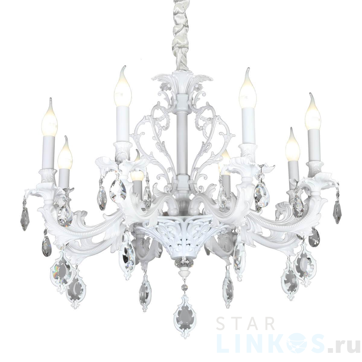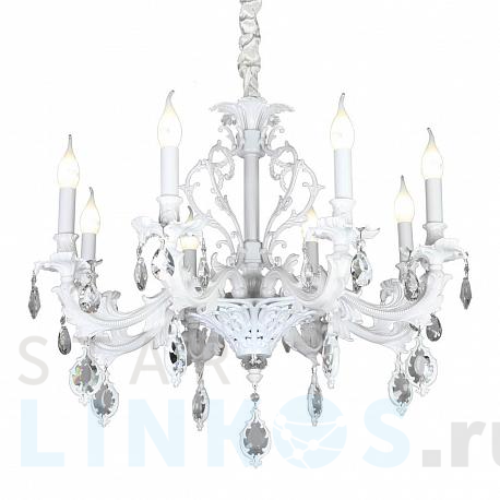 Поставщик рекомендует использовать лампы накаливания с цоколем E14 для освещения площади 18 м2. Подвесная люстра Omnilux Senis OML-74713-08 в классическом стиле используется в интерьере гостиной с установкой на потолок.