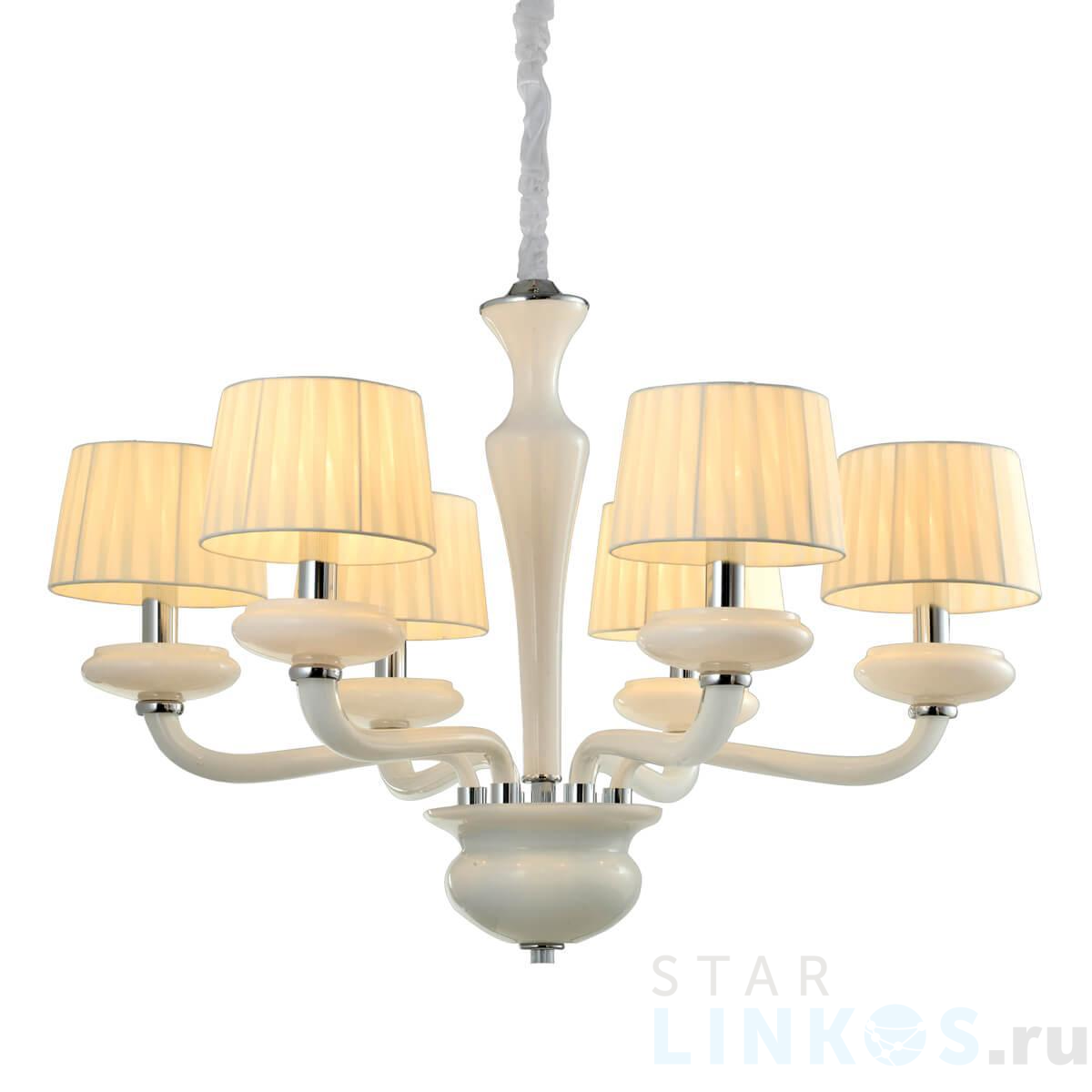 Поставщик рекомендует использовать лампы накаливания с цоколем E14 для освещения площади 14 м2. Подвесная люстра Omnilux Stella OML-86003-06 в классическом стиле используется в интерьере спальни с установкой на потолок.