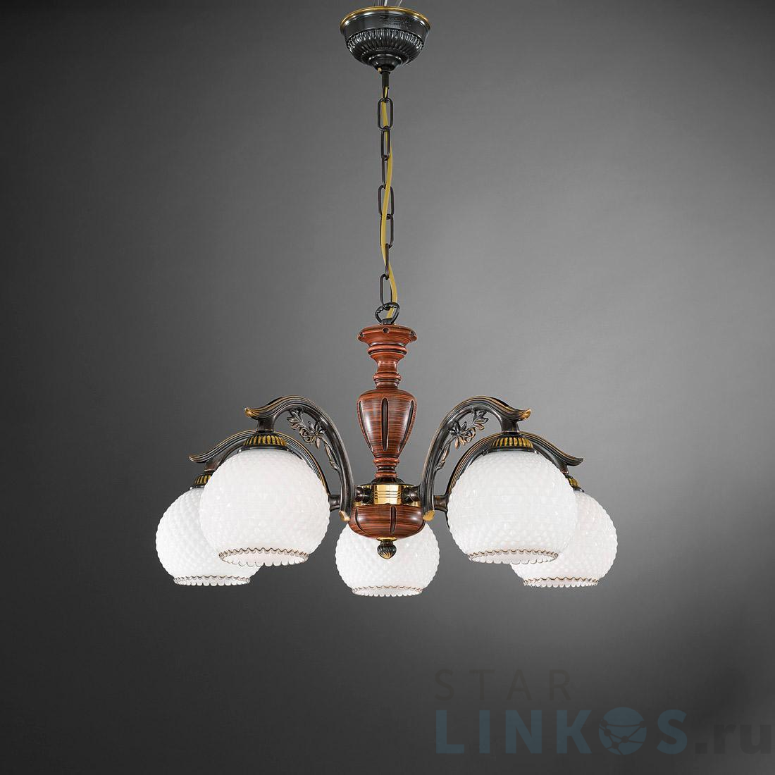 Поставщик рекомендует использовать лампы накаливания с цоколем E27 для освещения площади 15 м2. Подвесная люстра Reccagni Angelo L.8610/5 в кантри-стиле используется в интерьере гостиной с установкой на потолок.