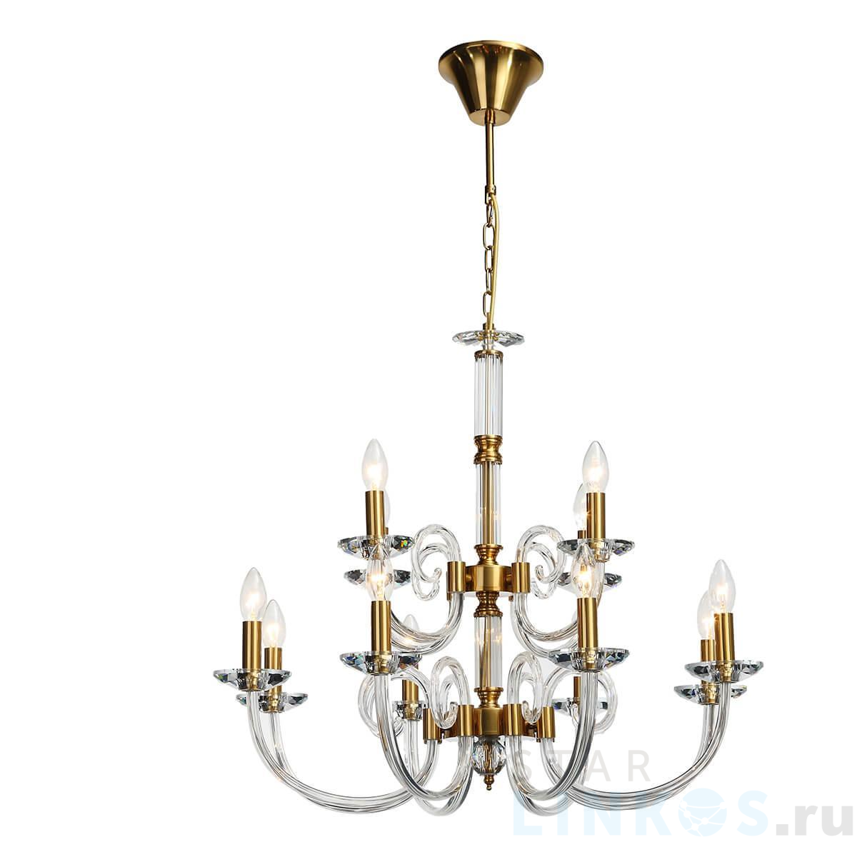 Поставщик рекомендует использовать лампы накаливания с цоколем E14 для освещения площади 26,7 м2. Подвесная люстра Stilfort Glass 1050/03/12P в классическом стиле используется в интерьере гостиной с установкой на потолок.