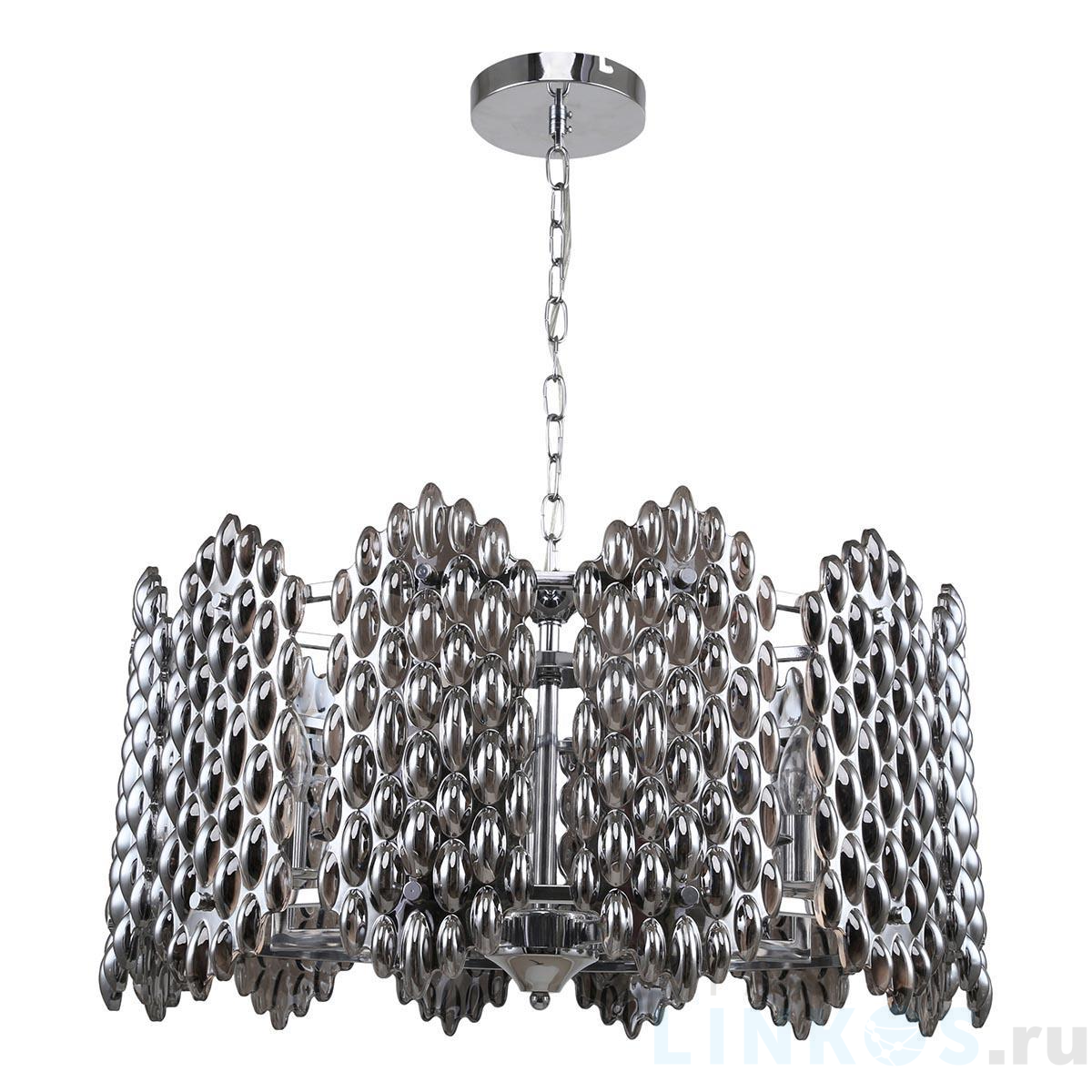 Поставщик рекомендует использовать лампы накаливания с цоколем E14 для освещения площади 11,1 м2. Подвесная люстра Stilfort Glazgo 1007/09/05P в используется в интерьере спальни с установкой на потолок.
