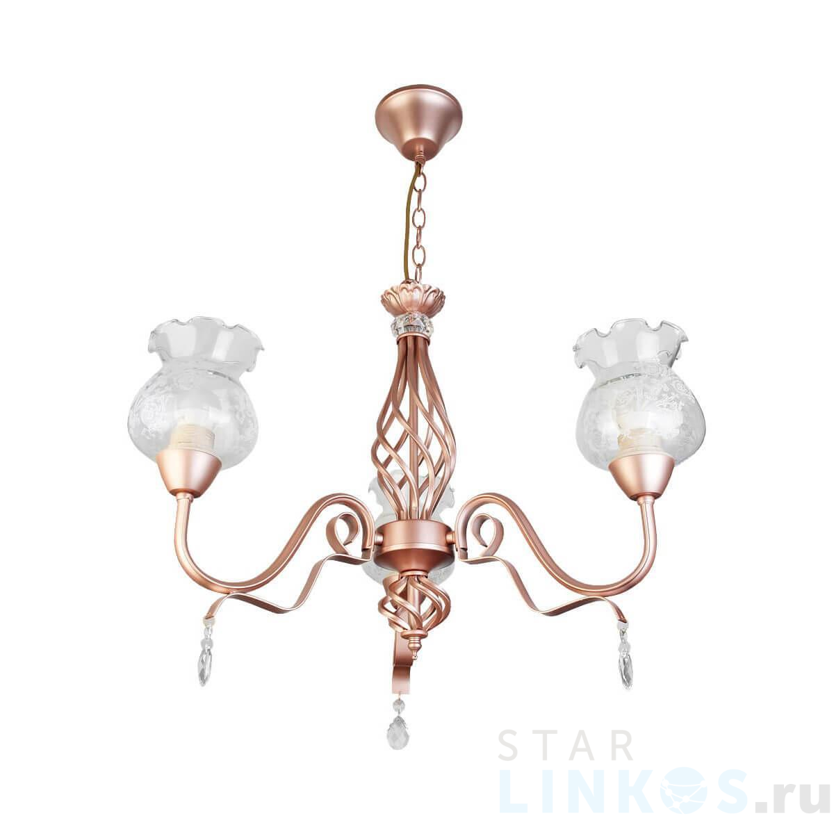 Поставщик рекомендует использовать лампы накаливания с цоколем E27 для освещения площади 10 м2. Подвесная люстра Toplight Kelli TL5680D-03PG в кантри-стиле используется в интерьере кухни с установкой на потолок.