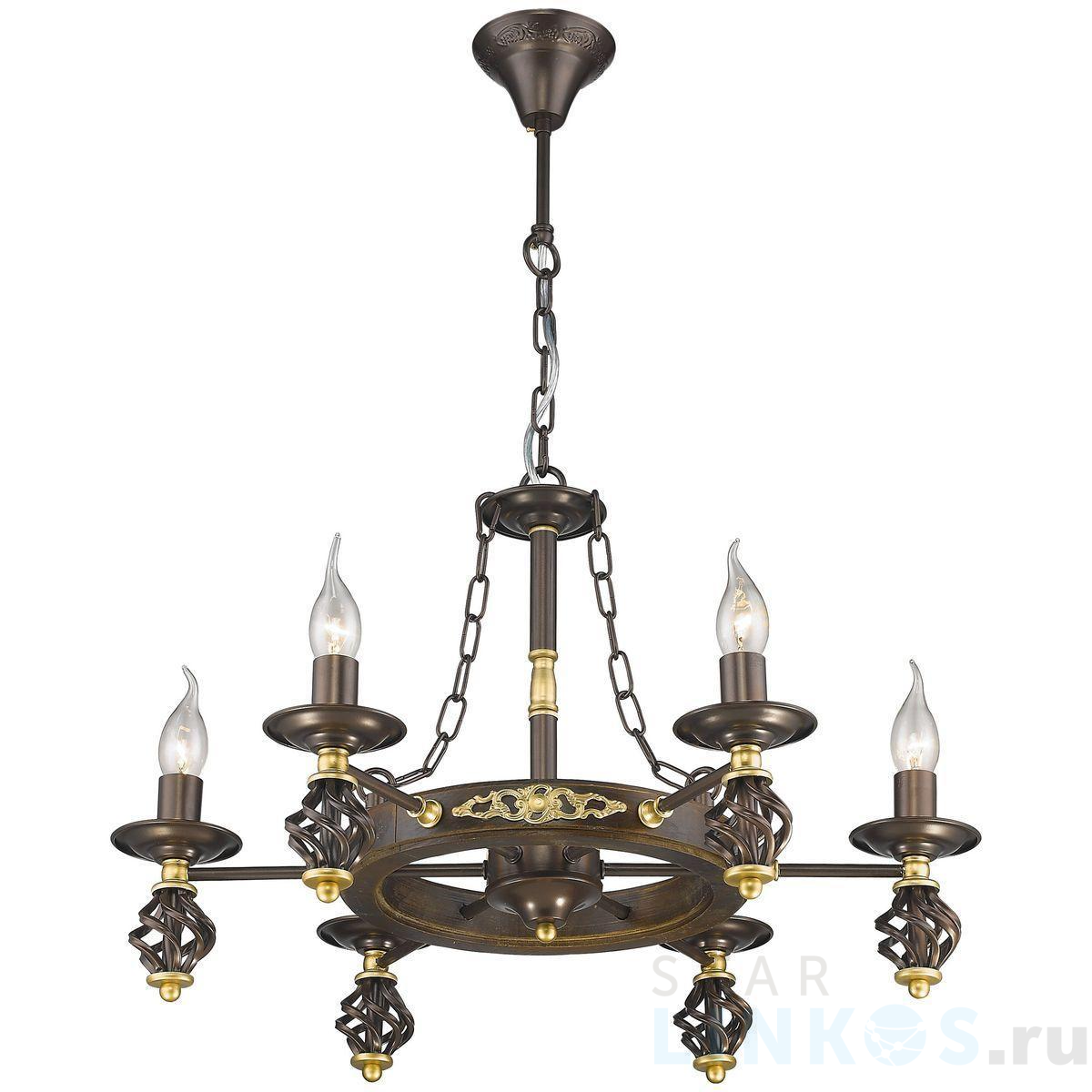 Поставщик рекомендует использовать лампы накаливания с цоколем E14 для освещения площади 20 м2. Подвесная люстра Velante 536-723-06 в замковом стиле используется в интерьере спальни с установкой на потолок.