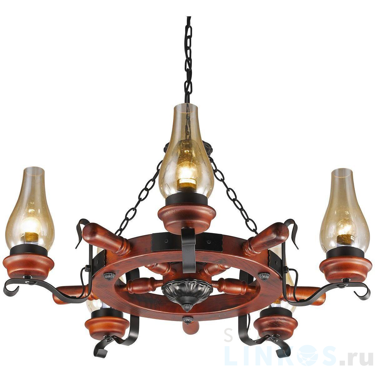 Поставщик рекомендует использовать лампы накаливания с цоколем E27 для освещения площади 16,7 м2. Подвесная люстра Velante 583-703-05 в кантри-стиле используется в интерьере кафе и ресторанов с установкой на потолок.