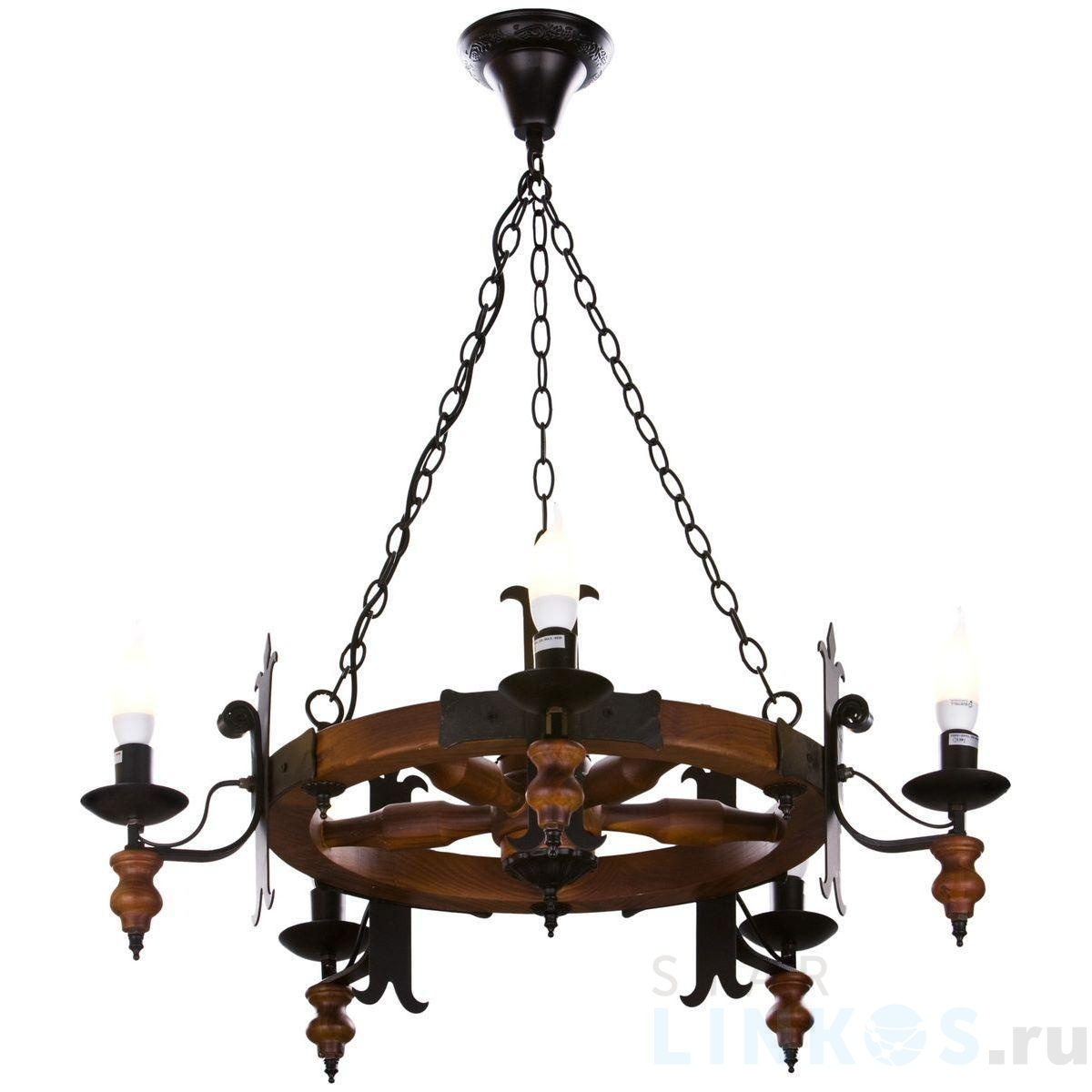 Поставщик рекомендует использовать лампы накаливания с цоколем E14 для освещения площади 11,1 м2. Подвесная люстра Velante 586-703-05 в кантри-стиле используется в интерьере кафе и ресторанов с установкой на потолок.