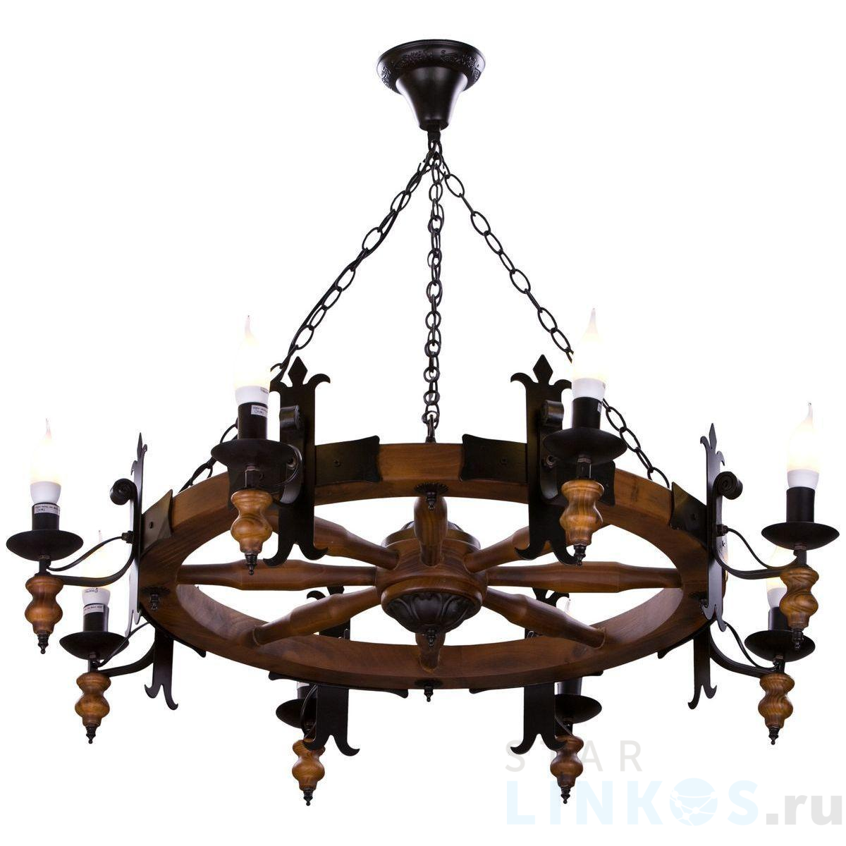Поставщик рекомендует использовать лампы накаливания с цоколем E14 для освещения площади 17,8 м2. Подвесная люстра Velante 586-703-08 в кантри-стиле используется в интерьере кафе и ресторанов с установкой на потолок.
