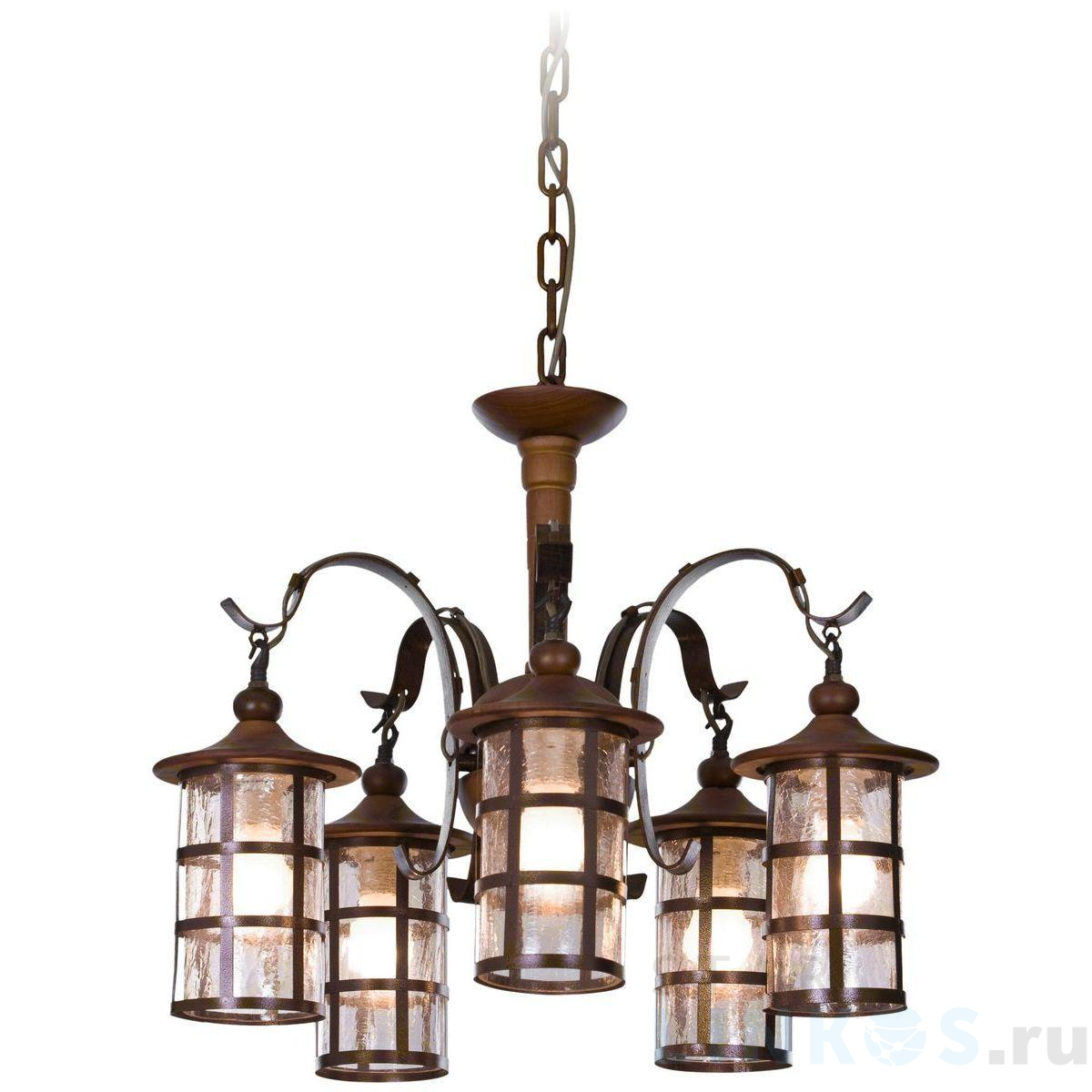 Поставщик рекомендует использовать лампы накаливания с цоколем E27 для освещения площади 16,7 м2. Подвесная люстра Velante 588-703-05 в кантри-стиле используется в интерьере кафе и ресторанов с установкой на потолок.
