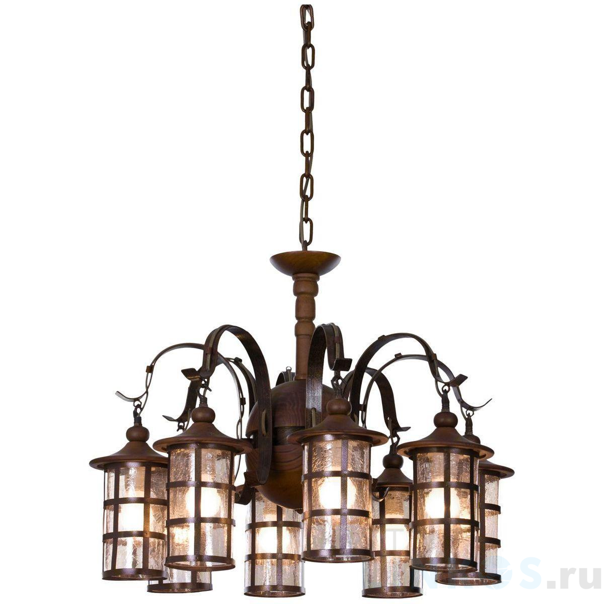 Поставщик рекомендует использовать лампы накаливания с цоколем E27 для освещения площади 26,7 м2. Подвесная люстра Velante 588-703-08 в кантри-стиле используется в интерьере кафе и ресторанов с установкой на потолок.